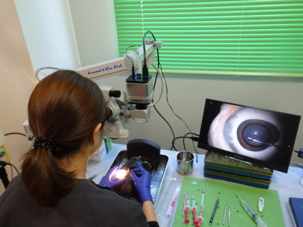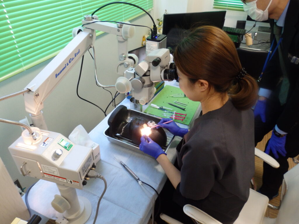 また抗VEGF硝子体注射の院内勉強会に参加し、豚眼を用いての白内障実習(Wet Lab)も行いました。